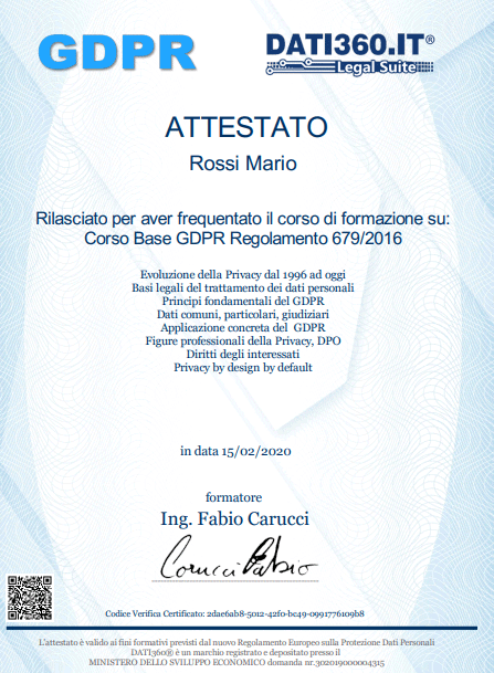 Al termine del corso viene rilasciato un attestato valido ai fini formativi GDPR
